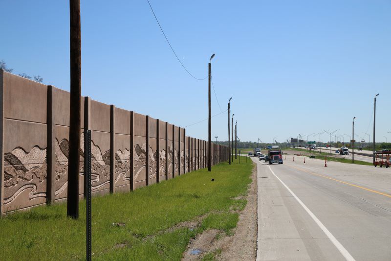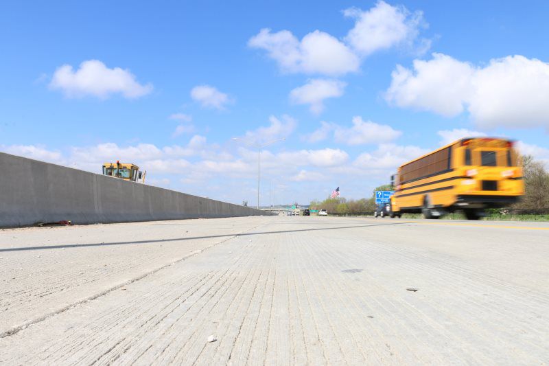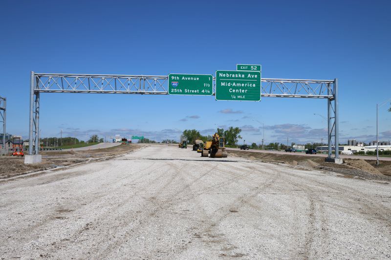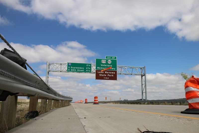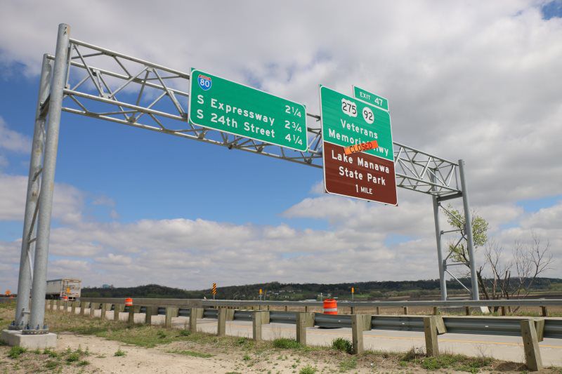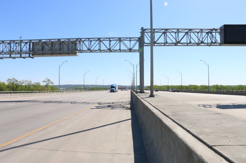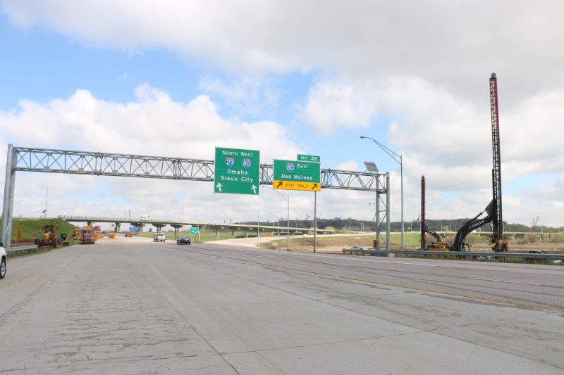 A signing package was completed in conjunction with this project. It consisted of (1) Overhead DMS Sign structure with IADOT's standard spread footing and stem wall construction for the foundations, (21) steel breakaway sign post, (787 sq ft) of Type B extruded back sign panels, a 70' signing mast arm, delineators, mile markers, and chevron guidance markers.