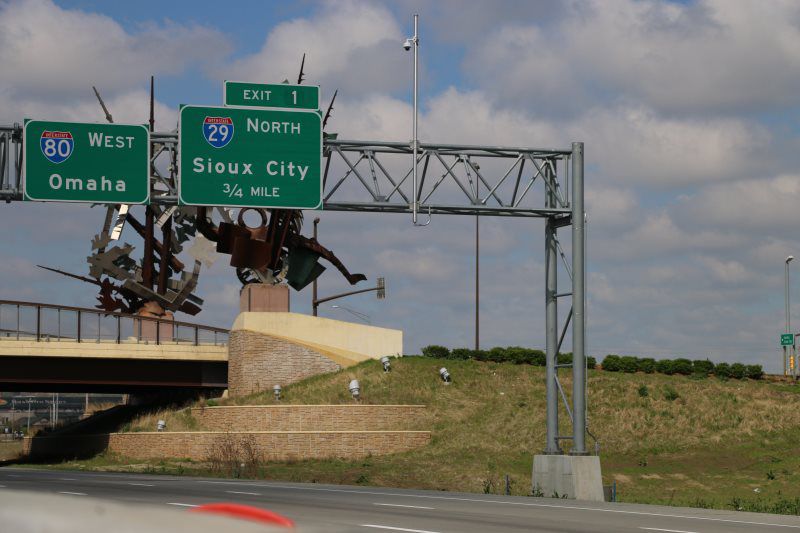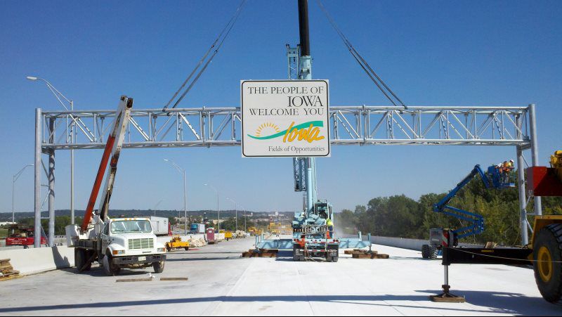 Existing overhead sign structures in the way of the new construction were removed during nighttime lane closures and rolling roadblocks. The new sign structures were installed in this same manner. Due to the requirement to keep lanes open, a 120ton crane was used to set the 34,000lbs, 130' sign structure at nighttime under a 15 minute closure of I29 northbound. The setting of the horizontal section, complete with new signage, was set in under 8 minutes with traffic moving again. High praises were given by the IADOT Commercial vehicle enforcement, IADOT, and the Joint Venture on another smooth, thoroughly coordinated and executed installation.