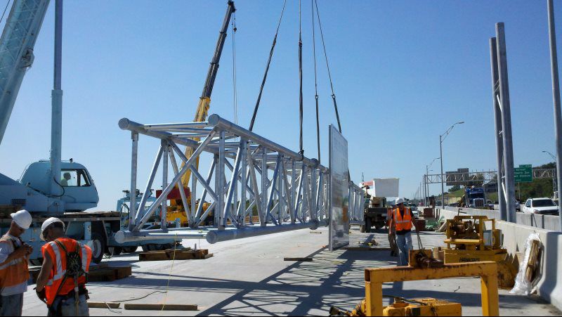 Major work included (32) bridge mounted lighting poles, (2) 89' overhead sign structures, (1) 110' sign structure, (1) 95' overhead DMS sign structure with Daktronics DMS sign installation, (7900') electrical circuits, (1088 sq ft) of Type B extruded back sign panels, (12000') 2" galvanized rigid steel conduit system installed in the concrete barrier bridge rail, and bridge navigation lighting system