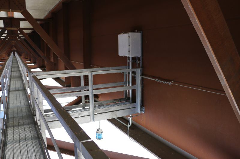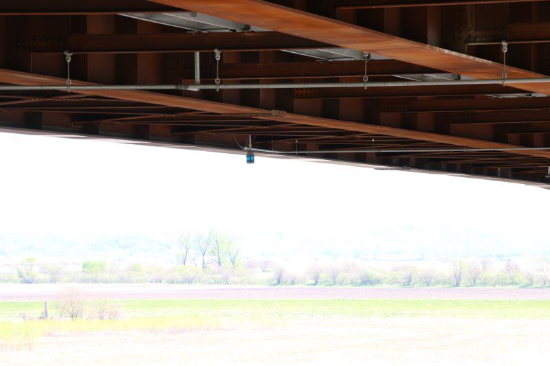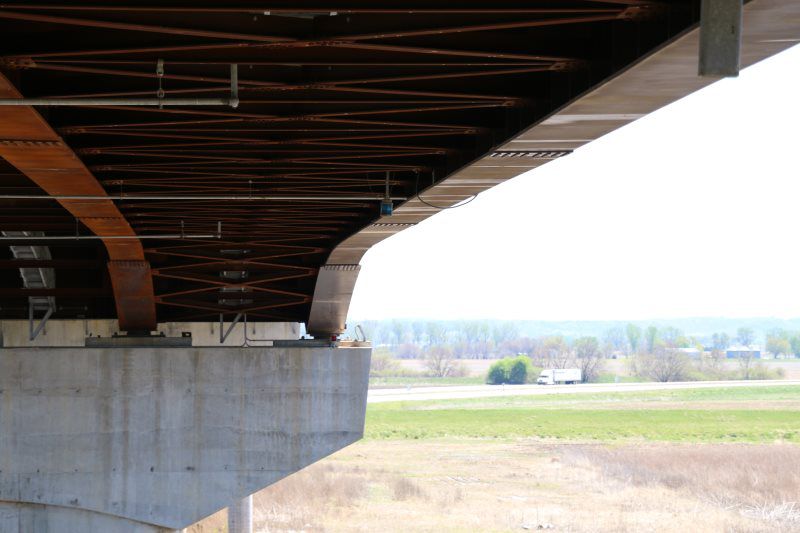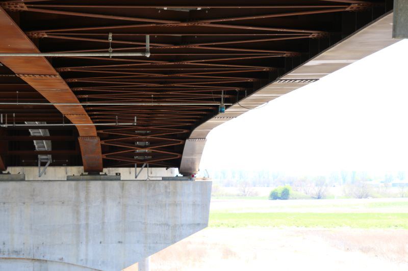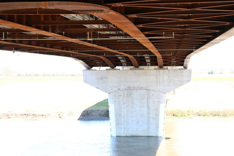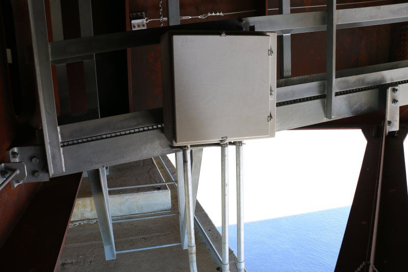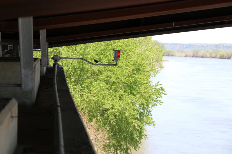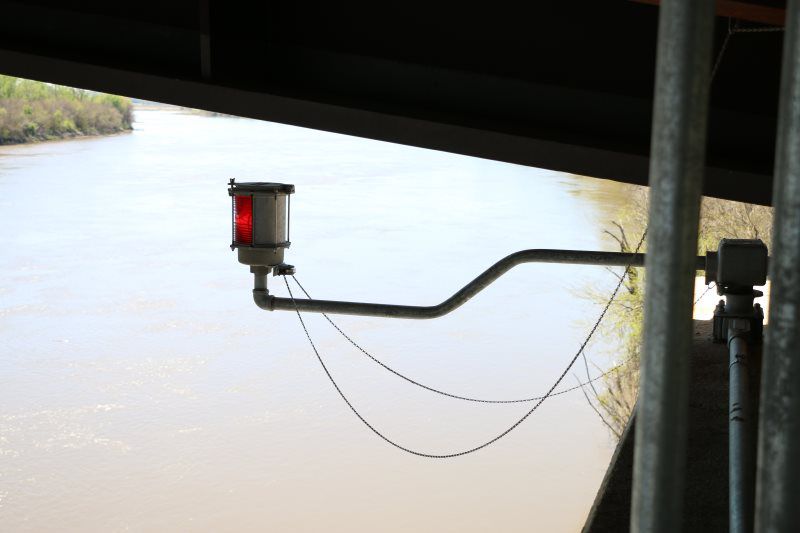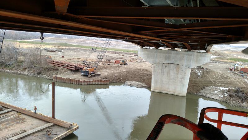 Major work included the installation of a solar powered bridge navigation lighting system and warning signs. Due to the rural nature of the bridge over the Missouri River and length of the bridge, utility power was not available. The work was completed off of badges anchor in the river bed and 80’ telescoping boom lifts for the installation of the conduit system tying the solar powered batteries to each of the navigation lights for the center and edge of channel. The work was slow and tedious due to the limited mobility the river necessitated.