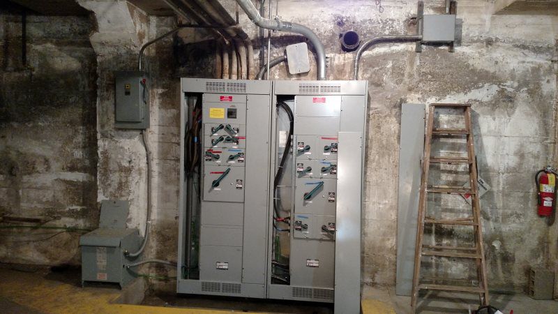 The difficulties in this Project were finding and installing a new 2-section 800 amp rated Main Service Switchboard with branch fusible switches that would fit back into the existing footprint area and the removal of large rigid steel raceways with large diameter conductors and reworking them to connect back into the new Switchboard. This work had to be accomplished after hours over a weekend.